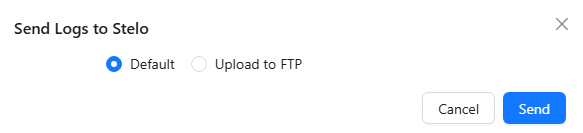 - A dialogue will appear asking if logs should be sent to Stelo (default) or to a different FTP location. Select Default and then Send to send the logs to the Stelo Support Team.