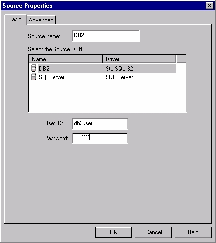 - Select the DSN that connects to the source database that contains the data you want to replicate, and enter a user ID and password that has permission to access that database.